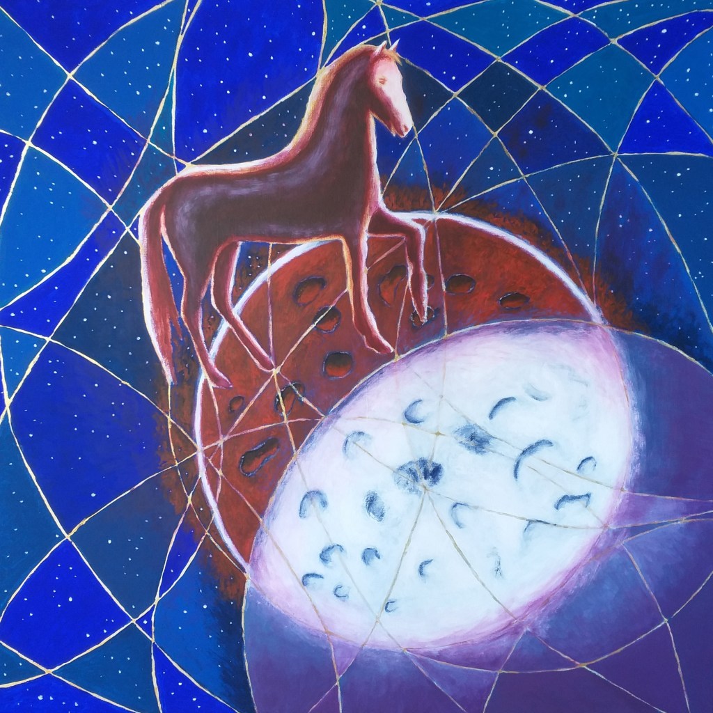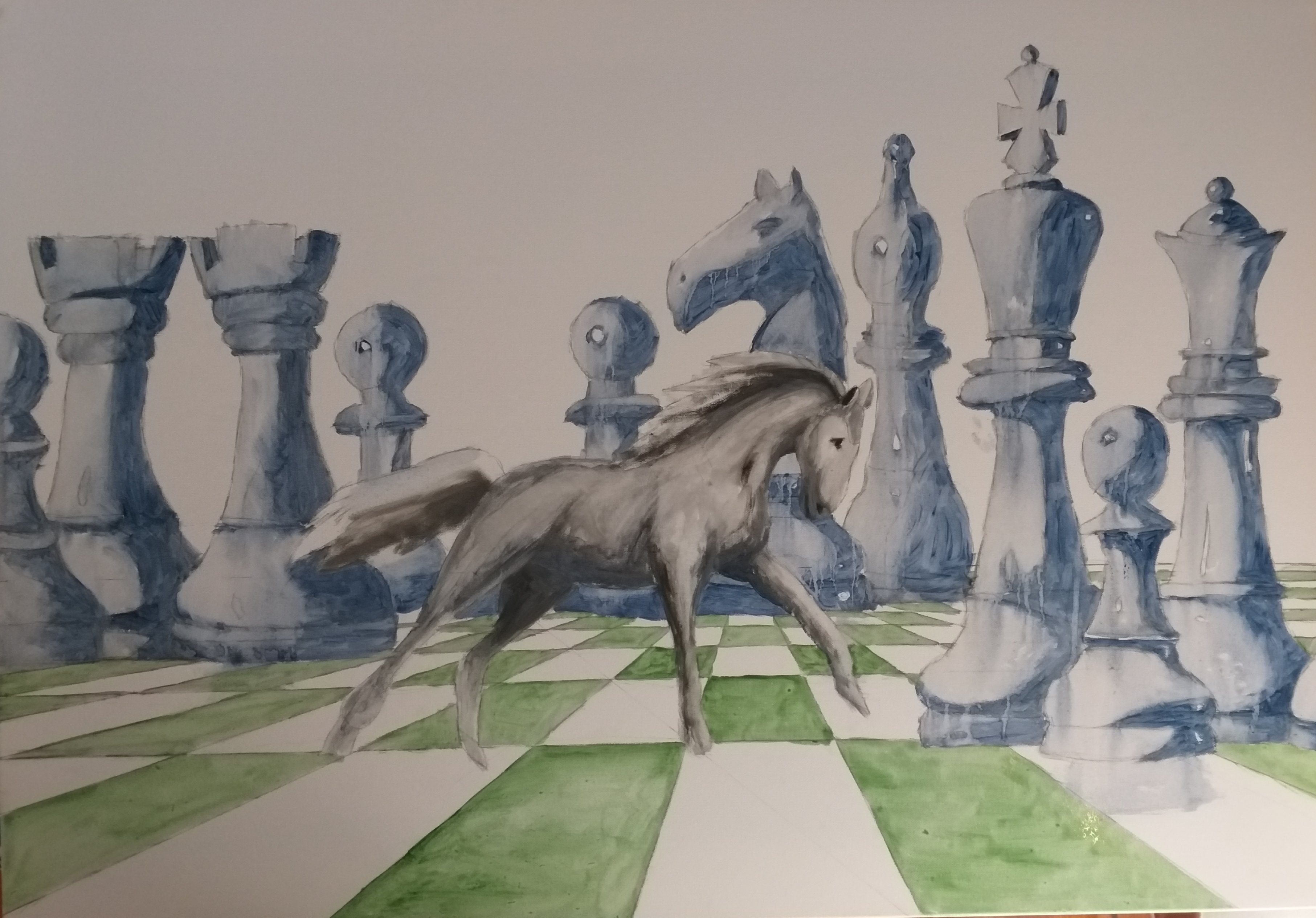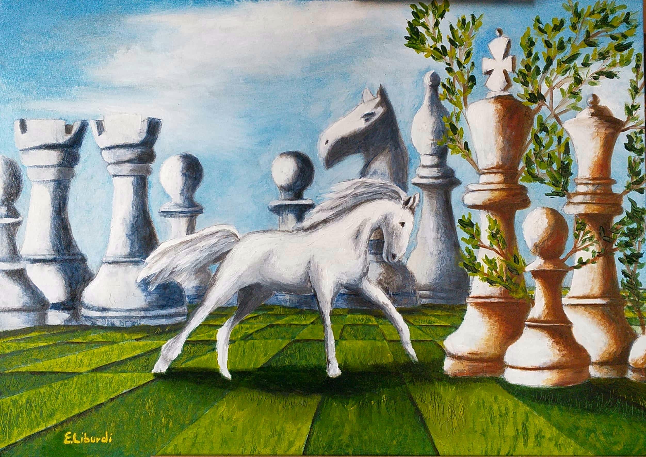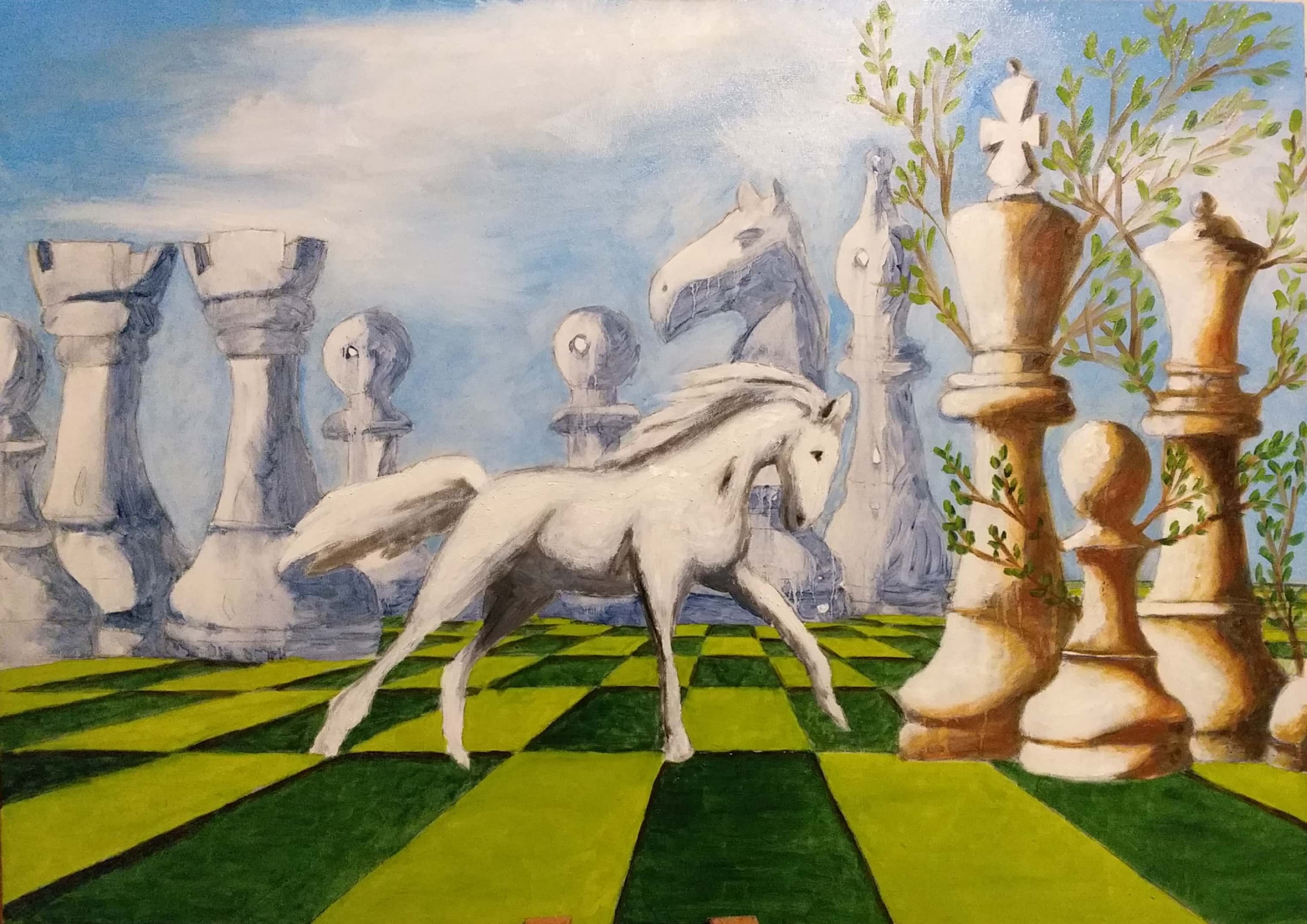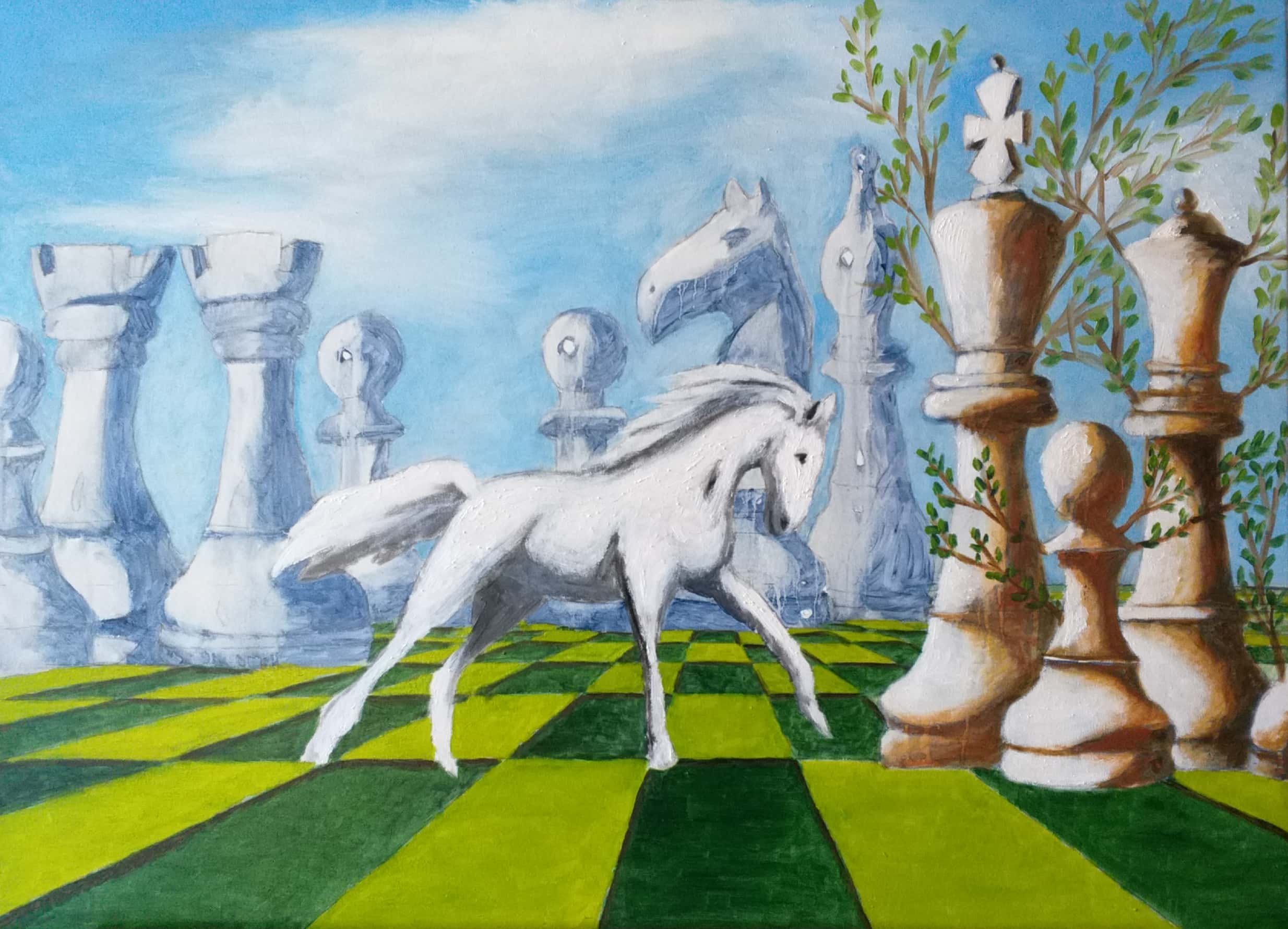 Il dipinto rappresenta due fazioni (cavalli) in lotta tra loro e divise da pensieri (colori) contrastanti, che giocano a scacchi la partita della vita altrui. L’unica salvezza è rappresentata dalle nuove generazioni che con la loro saggezza e innocenza riescono a fondere i due pensieri e a creare l’unione, la pace.