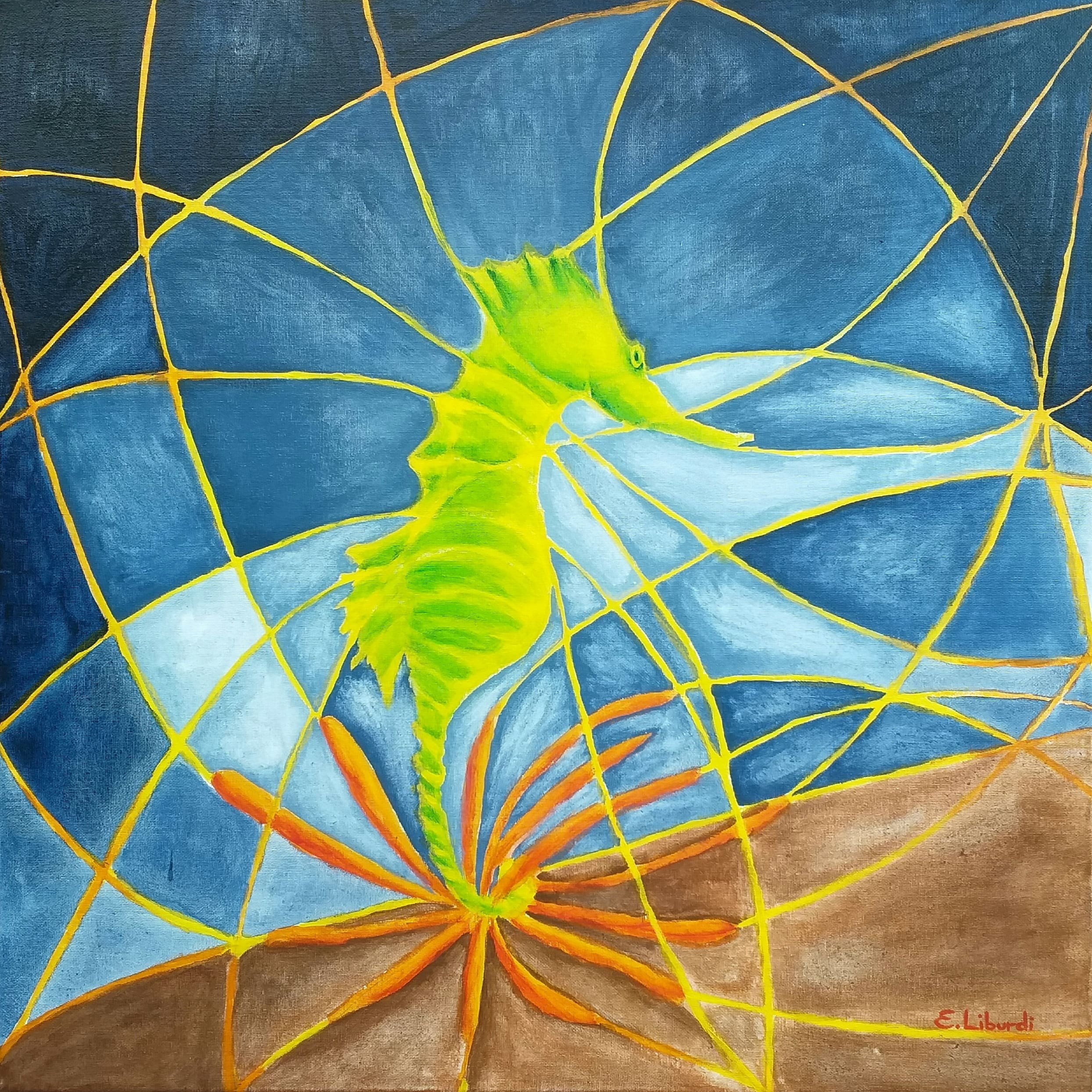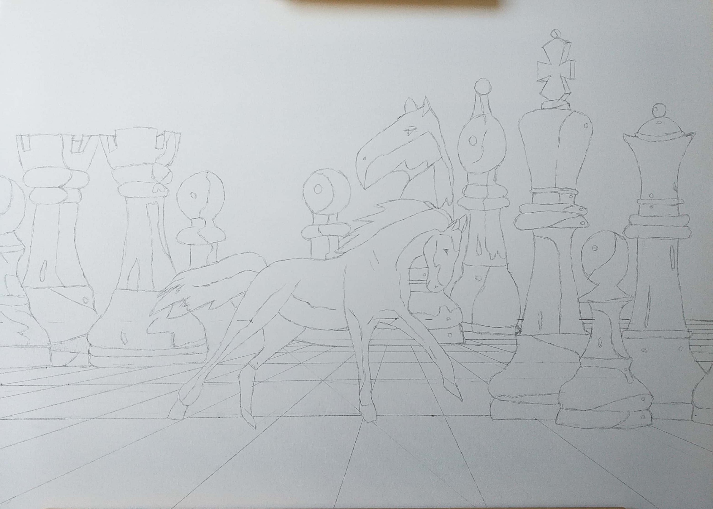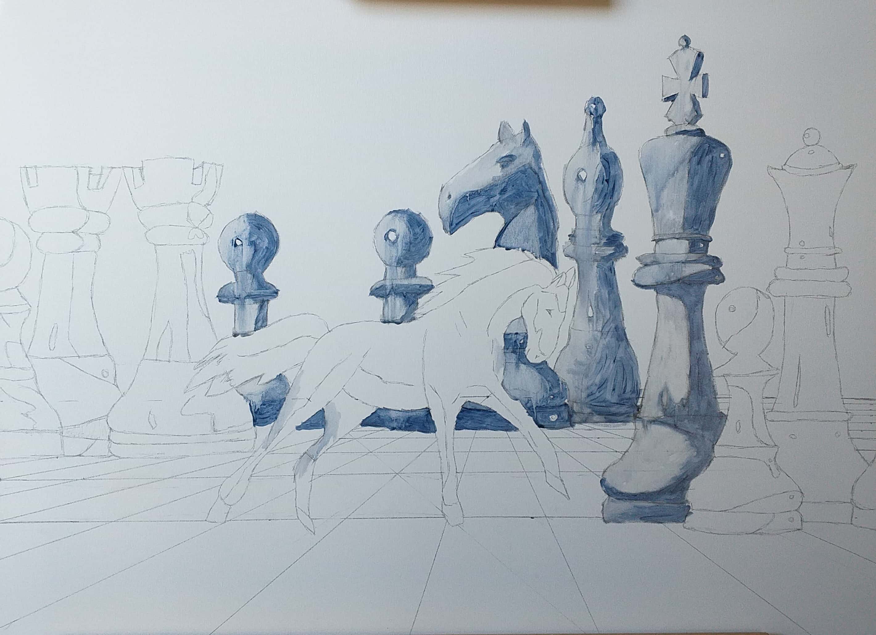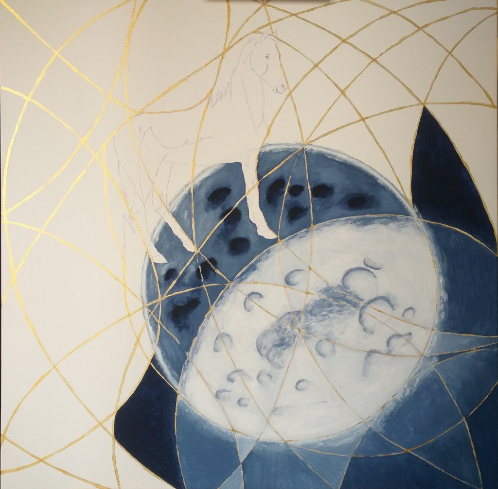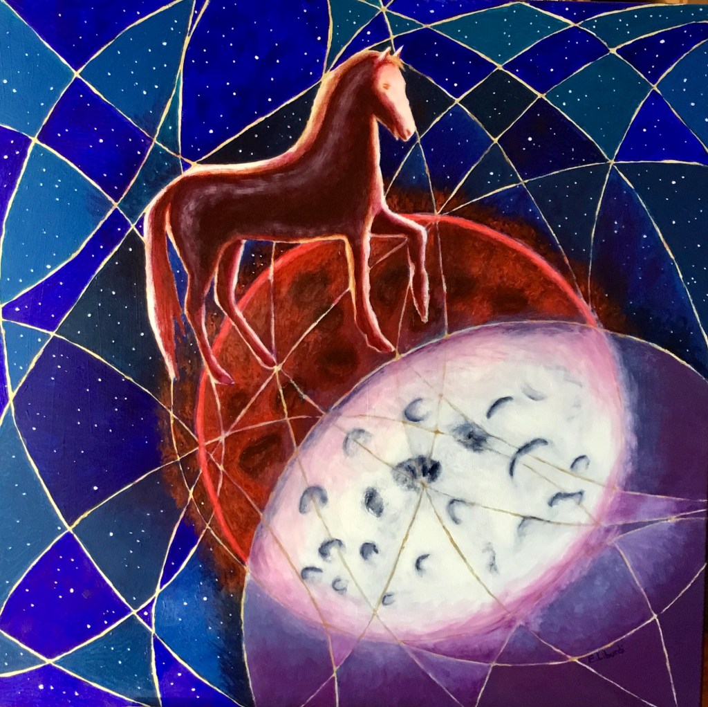 Il dipinto rappresenta due fazioni (cavalli) in lotta tra loro e divise da pensieri (colori) contrastanti, che giocano a scacchi la partita della vita altrui. L’unica salvezza è rappresentata dalle nuove generazioni che con la loro saggezza e innocenza riescono a fondere i due pensieri e a creare l’unione, la pace.