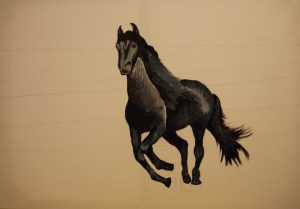 Dopo aver disegnato a matita il cavallo, procediamo con la stesura del colore. Sono necessari questi pigmenti: Nero, Blu di Prussia, Bianco, Giallo. Prepariamo i colori diluendoli solo con l’olio di lino (rende i pigmenti più lucidi, in questo caso dobbiamo rendere l’impressione del manto splendente del cavallo).